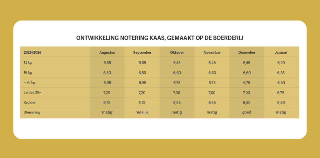 Ook de markt voor boerderijkaas ontkomt niet aan de malaise op de zuivelmarkt. De afzet in december was goed, al lag deze veelal iets lager dan vorig jaar. Het eerste kwartaal is traditioneel rustiger en de voorraden zijn ruim. De verhouding tussen melkprijs en kaasprijs is complex, maar duidelijk met elkaar verbonden. Lagere melkprijzen kunnen leiden tot een hogere kaasproductie bij bedrijven die melk aankopen, wat het aanbod vergroot. Daarnaast neemt de concurrentie van fabriekskazen toe, waarvan de prijzen eveneens zijn verlaagd. Dit speelt vooral in de supermarkt, maar heeft ook invloed op andere afzetkanalen. Handelaren geven aan dat een lagere kaasprijs meer ruimte biedt om de afzet op peil te houden en promotieacties te voeren. De commissie heeft daarom besloten de noteringen voor deze maand met € 0,25 te verlagen. De stemming in de markt is matig.