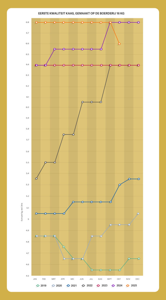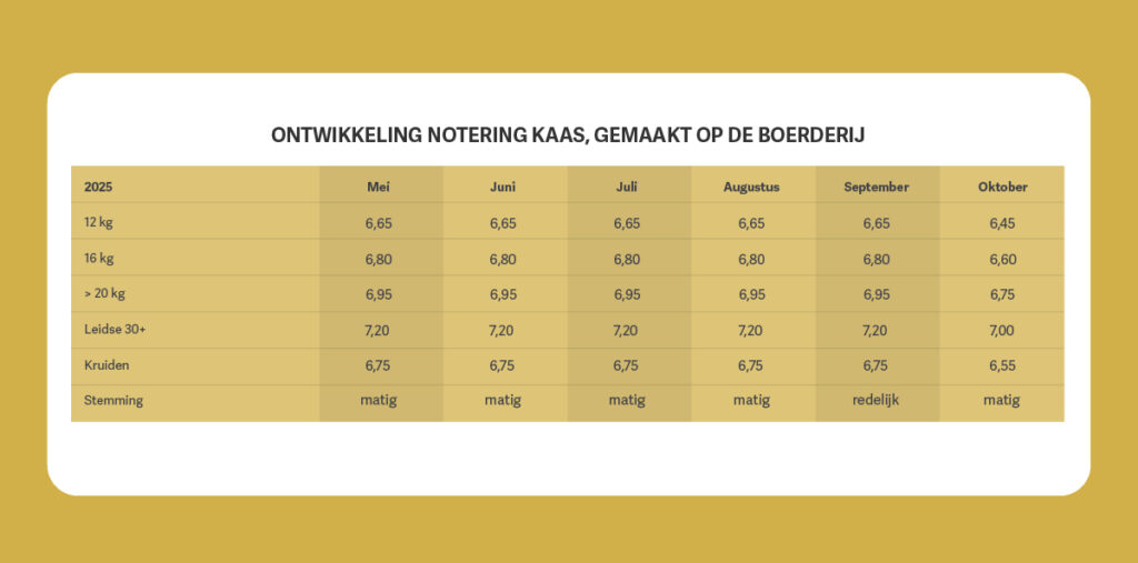 De markt voor kaas, gemaakt op de boerderij, lijkt inmiddels beter in balans: veel bereiders hebben hun productie aangepast na overleg met handelaren, waardoor de voorraden niet verder groeien. De kaas die nu wordt aangevoerd, is grotendeels bestemd voor de eerste maanden van 2026: traditioneel een rustigere verkoopperiode. Hoewel de afzet op dit moment goed loopt, ervaren handelaren stevige prijsconcurrentie vanuit fabriekskazen. De noteringscommissie heeft daarom besloten om alle noteringen met € 0,20 te verlagen. De stemming op de markt is matig.